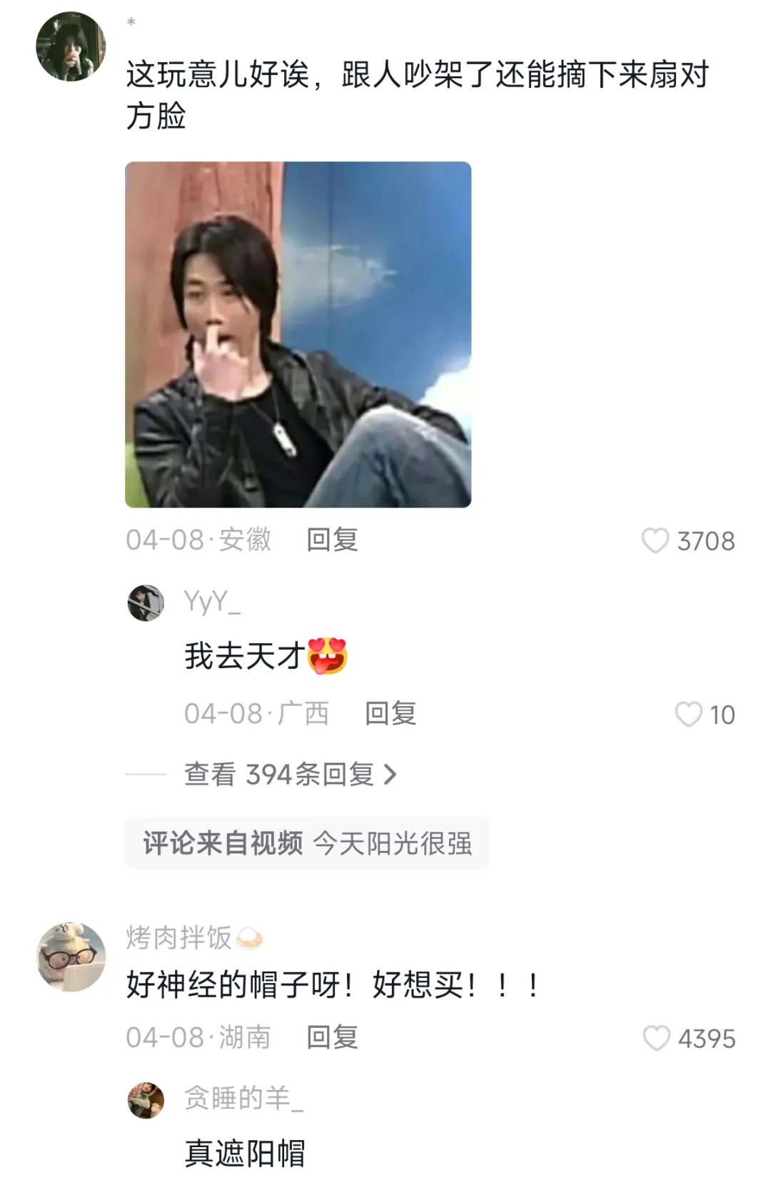有网友表示:“这个帽子能 360 度无死角遮住眼睛,跟人吵架了还能摘下来扇别人的脸。”,还有网友罗列出了诸多好处:“完美解决了不用把手晒黑,还能遮阳,还不会把头发捂出油。”