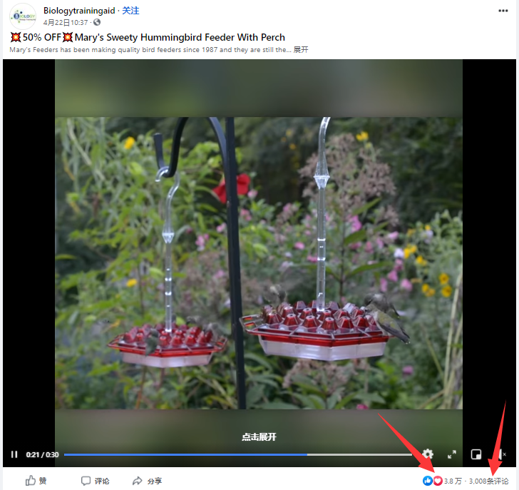 facebook上30秒的装置鸟类喂食器视频斩获3.8万播放量,3k+条评论。