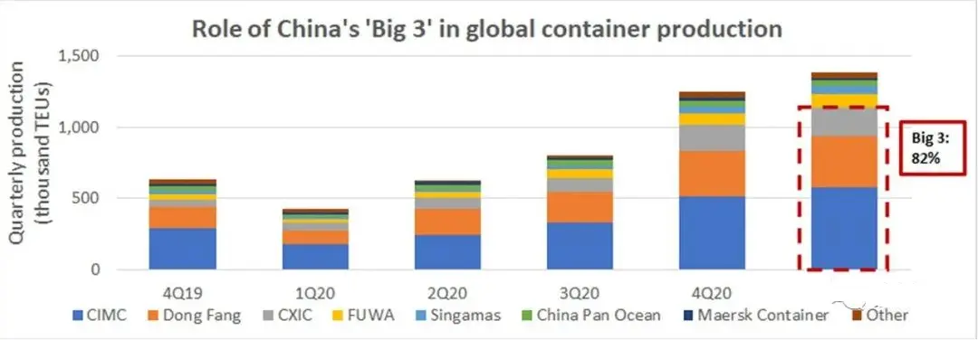据英国海事咨询公司德鲁里(Drewry)表示,目前中国工厂制造全球超过96%的干货集装箱和100%的冷藏集装箱,而且有三家中国公司占据了绝大部分的产量。