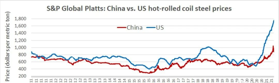 根据标普全球普氏能源资讯(S&P Global Platts)提供的数据,过去十年来,美国热轧卷钢(HRC)的价格平均比中国高28%。最近,美国的价格飙升至中国热轧卷钢价格的近两倍。