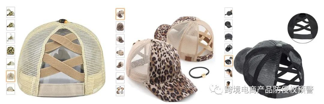 小编在亚马逊美国站上看到一款棒球帽,让我印象深刻的地方不是各种颜色或材质或图案的搭配,而是它那后脑勺处一致的设计元素。见下面我截图自亚马逊美国站的3款棒球帽的图片: