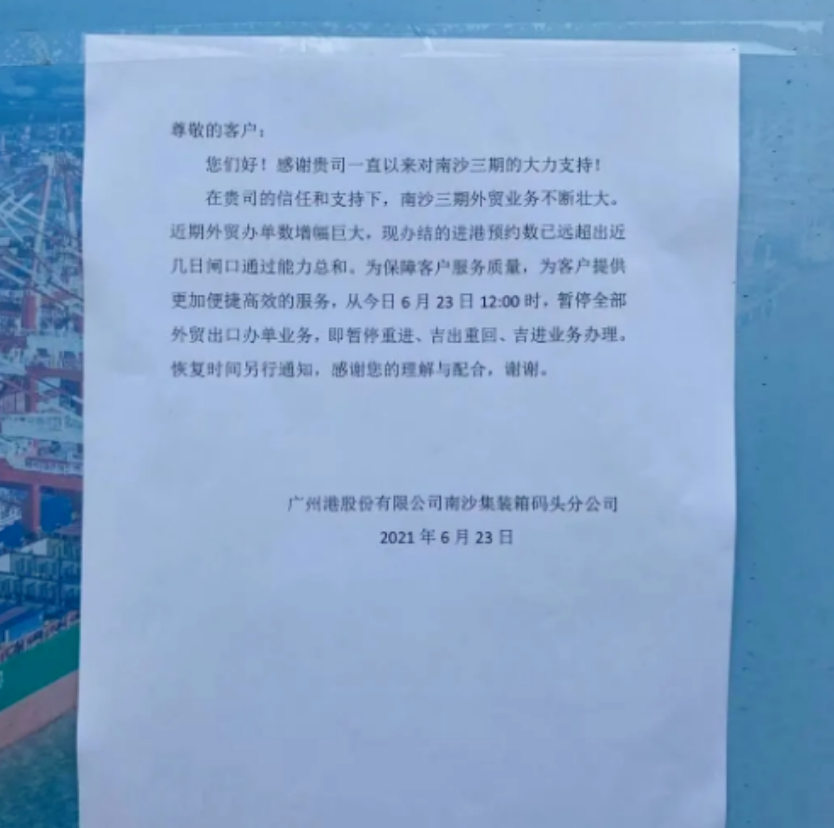 您们好!感谢贵司一直以来对南沙三期的大力支持!在贵司的信任和支持下,南沙三期外贸业务不断壮大。近期外贸办单数增幅巨大,现办结的进港预约数已远超出近几日闸口通过能力总和!为保障客户服务质量,为客户提供更加便捷高效的服务,从今日6月23日12:00时,暂停全部外贸出口办单业务!即暂停重进、吉出重回、吉进业务办理。恢复时间另行通知,感谢您的理解与配合,谢谢。广州港股份有限公司南沙集装箱码头分公司2021年6月23日但是,目前华南港口拥堵的情况如果需要完全恢复,最重要的还是要期待深圳盐田港尽快满血复活!