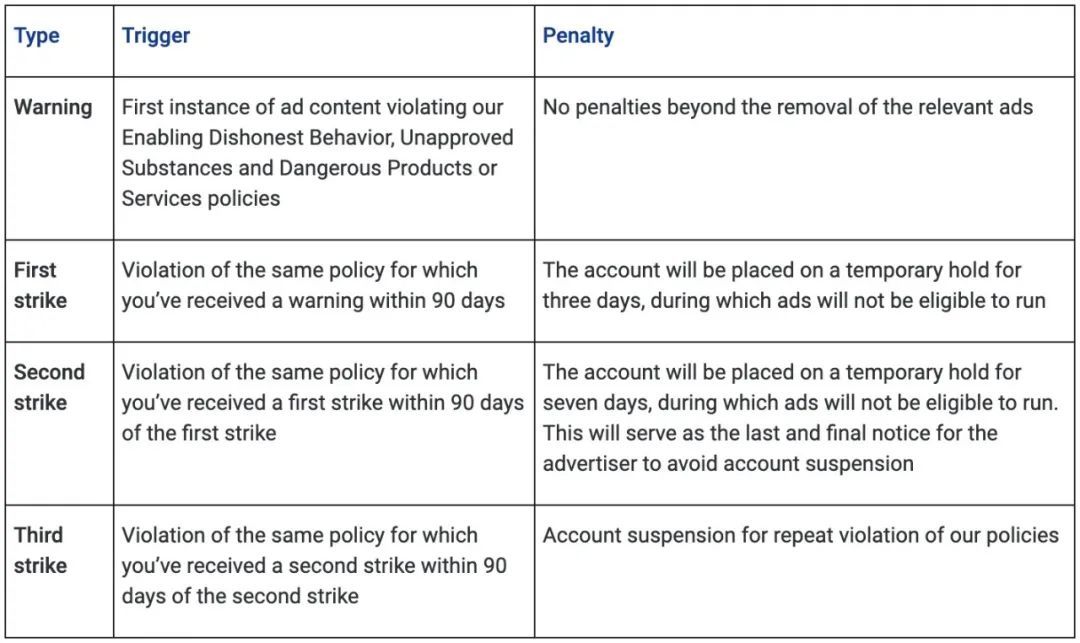 如果在First Strike之后的90天之内,再次违规,则处罚 Second Strike,处罚再次升级,系统会暂停广告投放7天。
