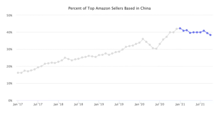 相反的,在 2021 年的大部分时间里,中国卖家在亚马逊市场上的市场份额一直在下降。 目前,38% 的顶级卖家位于中国,低于年初的 40%。