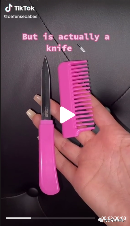 提供给我这一热卖方向的是一位专营防卫用品的卖家,主要售卖的是一些防狼警报器、防卫钥匙链等合规商品,而近期类似下图这种防卫梳在TikTok上播放量普遍不错,于是他找工厂做了一批类似商品试单,虽然刀具长度不构成管制刀具,但是出口依旧有限制,费了不少周折。