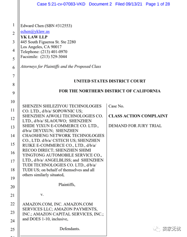 今年4月份以来,亚马逊对中国卖家大规模封店,据亚马逊官方承认"封了中国卖家600个品牌3000个店铺,预估损失超过千亿元(这个后来亚马逊官方辟谣了,所谓损失千亿,是从整个上下游供应链进行评估的,实际上涉及冻结金额可能在数亿美金+),亚马逊此次封号规模、范围以及严格程度都是历史首次。.根据9月13日提交的最新诉状,多家中国公司已经就封号事件在美国加州北区地方法院对亚马逊公司提起集体诉讼。图片来源于网