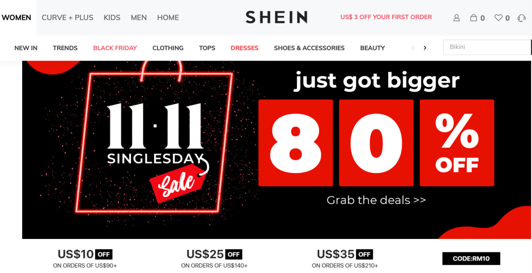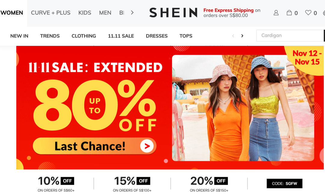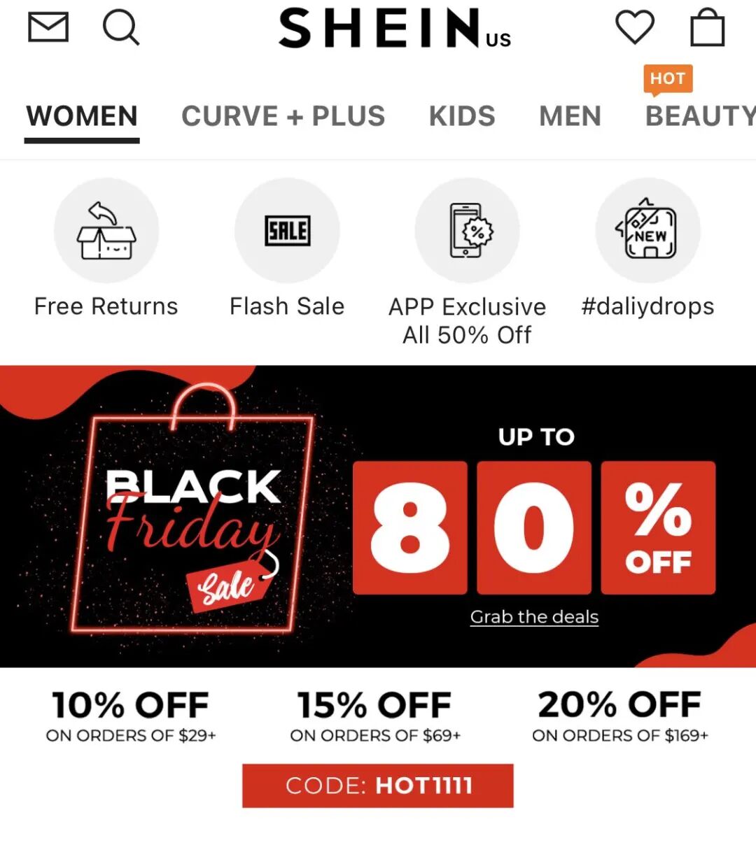 Shein在其官网和App,同步上线了黑五/双11促销页面。打开Shein的官网首页,直接就能看到显眼的活动海报,折扣高达80%!