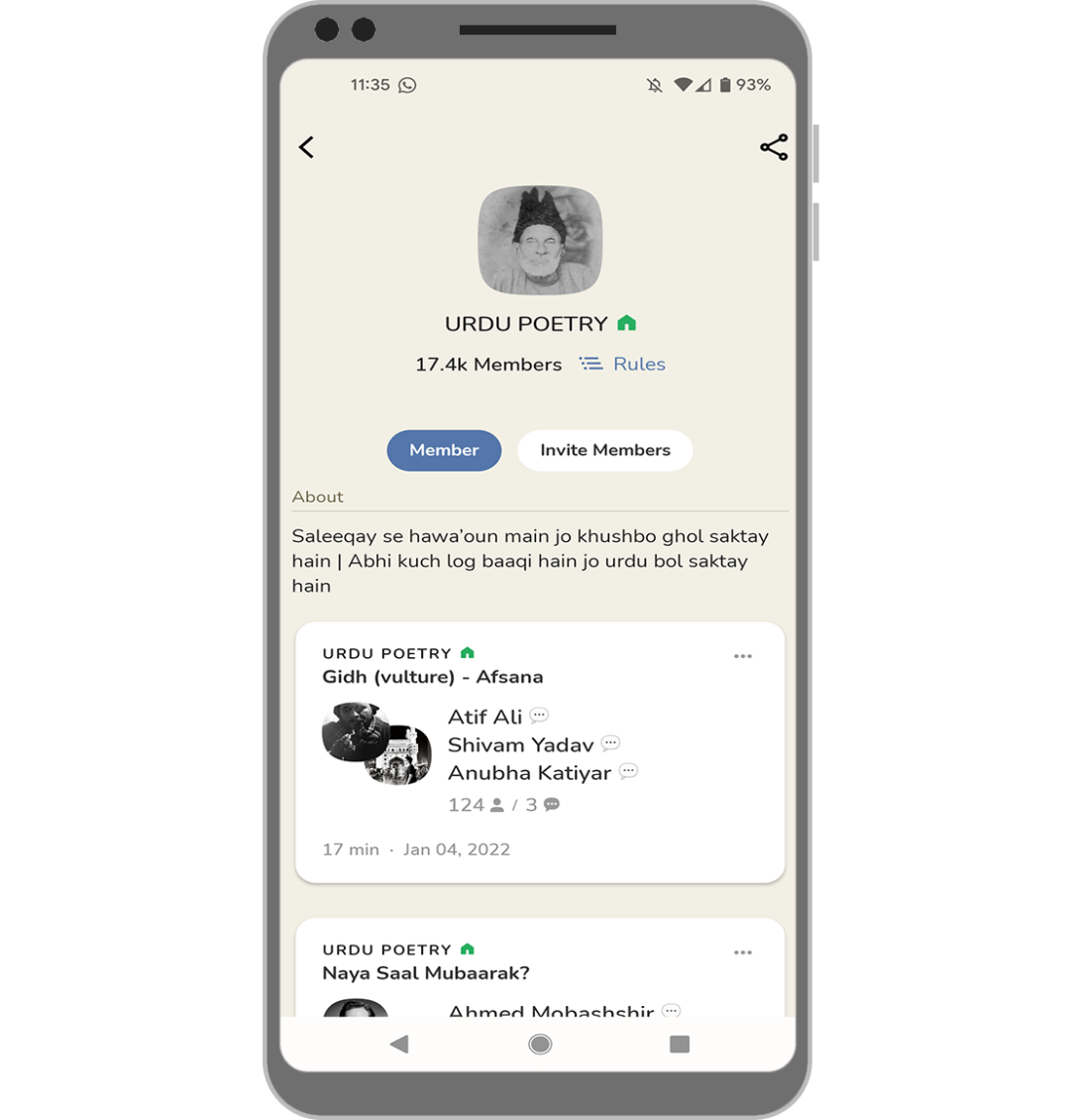 出于对乌尔都语(巴基斯坦官方语言)诗歌的热爱,一群来自印度和巴基斯坦的作者通过「Clubhouse」聚在了一起,组建了名为"Urdu Poetry"的房间。他们会在每周末晚出席名为"Bazm-e-Sukhan"的诗词创作会议,在这里房间成员们可以背诵并交流乌尔都语文学内容。
