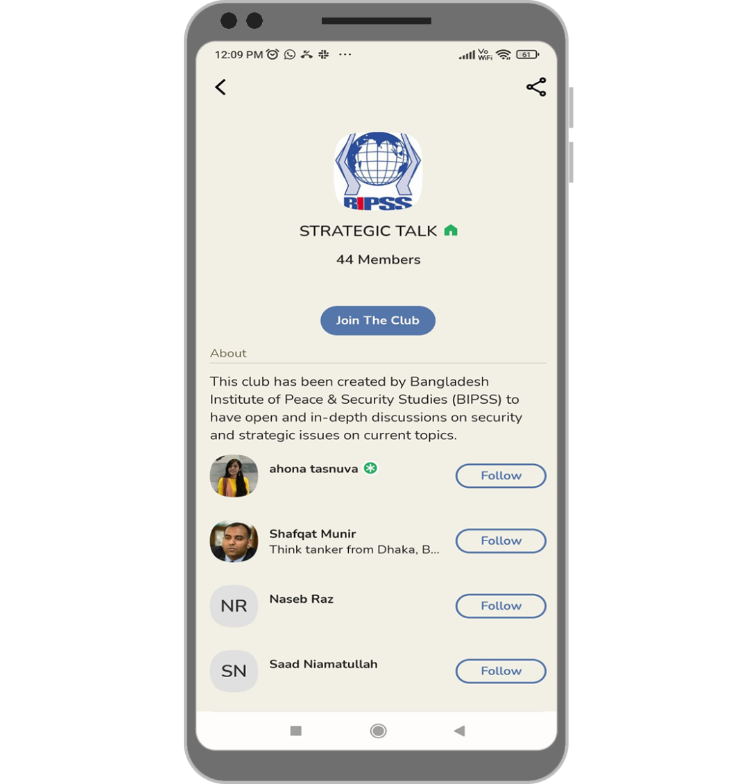 在孟加拉国,一个独立智库则在利用「Clubhouse」来唤醒人们对社会议题的关注,其中也包括女性独立自主等热点话题。这个名为"Strategic Talk"的房间由位于达卡的和平与安全研究学院(BIPSS)创立,BIPSS 表示,学院会在房间中"开放而深入地讨论社会发展话题"。