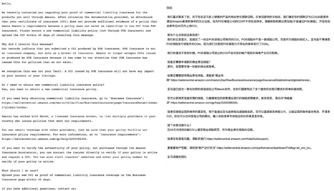 近日,陆续有卖家收到亚马逊官方邮件,称亚马逊不再接受POE保险发行或制作的COIs(保险证书)。