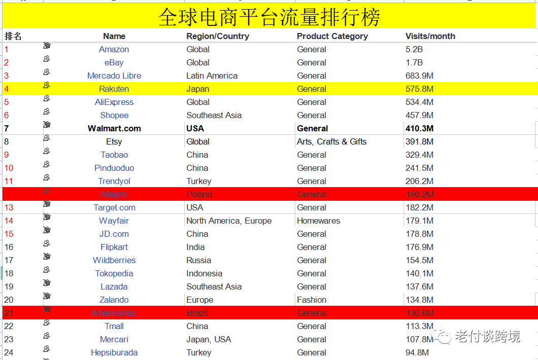 第一: 首先,我们来看看流量分析,全球排名前20的电商平台,月流量如何?