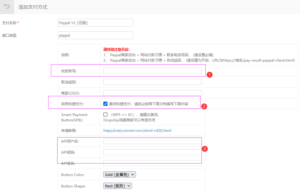 有了PayPal账号和API凭证就可以通过后台进行配置,如: