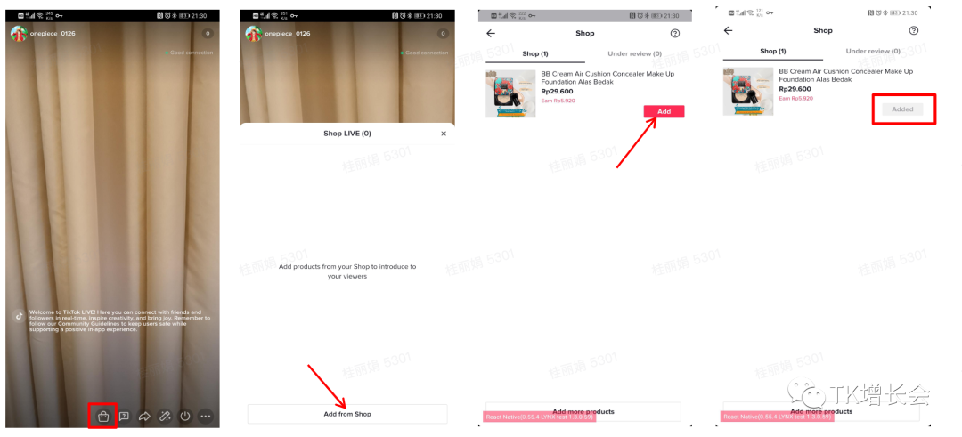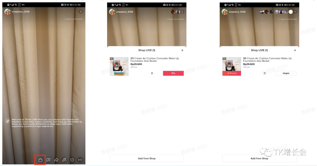 Step 3: 在商家直播界面找到购物袋图标,并点击"Add from Shop"为直播间添加商品