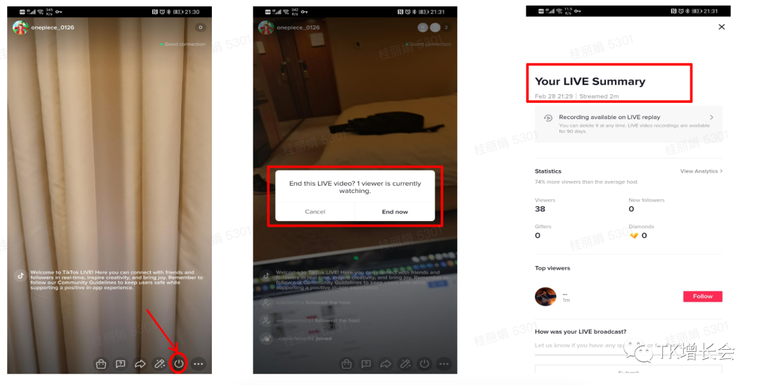 Step 5: 直播结束后,点击关闭标志,确认结束直播。