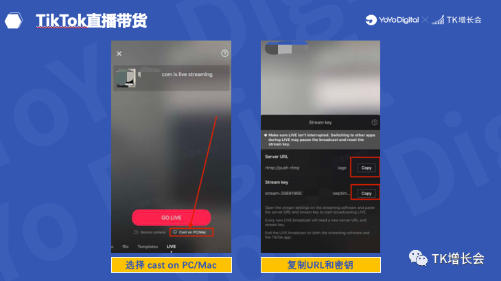 步骤二 : TikTok直播选择cast on PC/Mac,复制服务器URL和直播密钥;