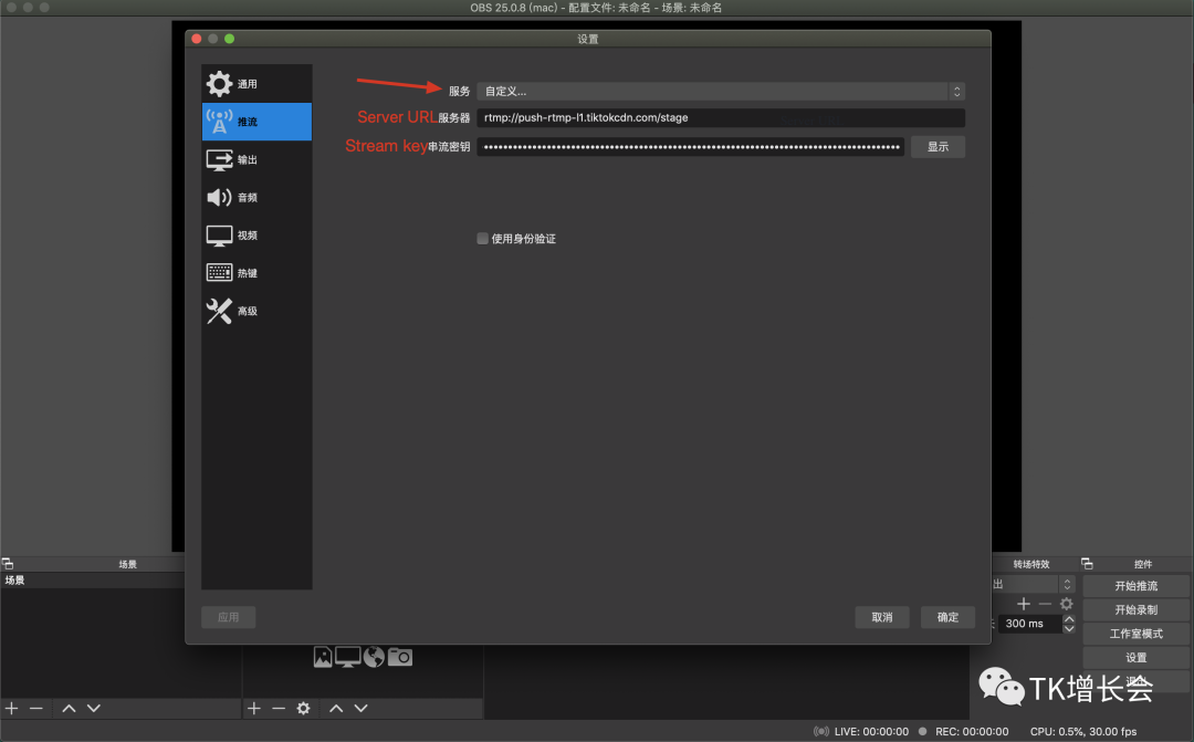 服务选择自定义,分别填写刚才复制的服务器Server URL & Stream key