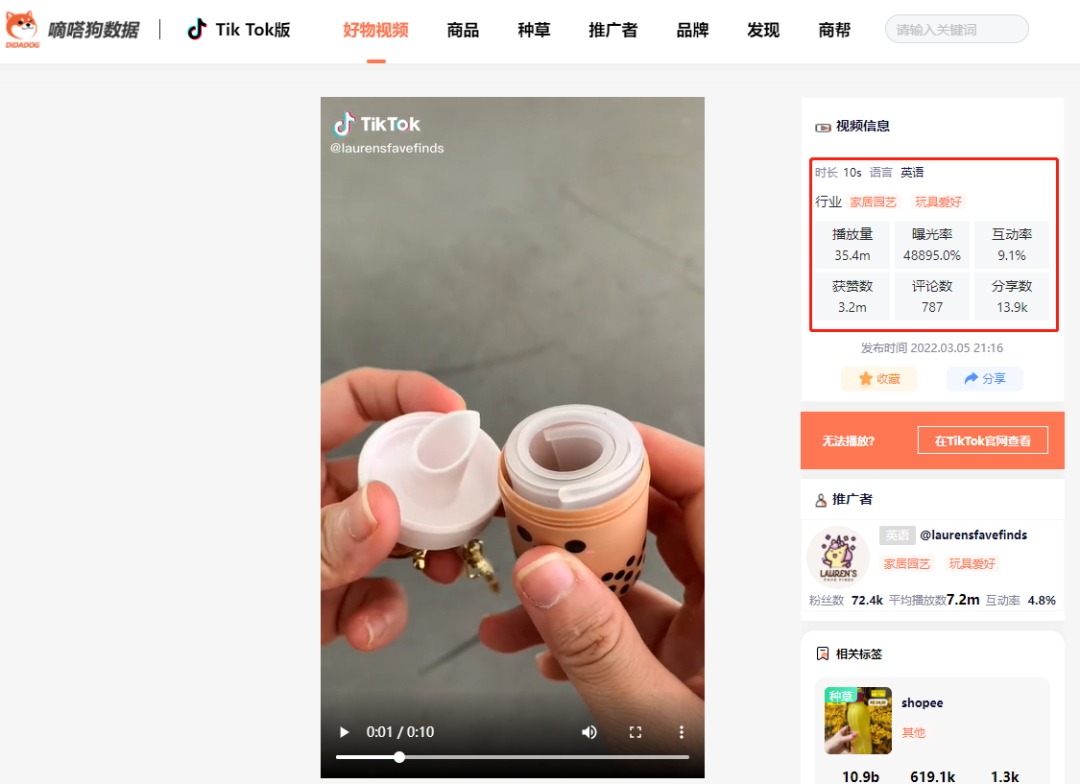 这条视频在3-5发布,仅仅过去十天时间,就已经获得了3500万播放,320万的点赞,曝光率达到了48895.0%。