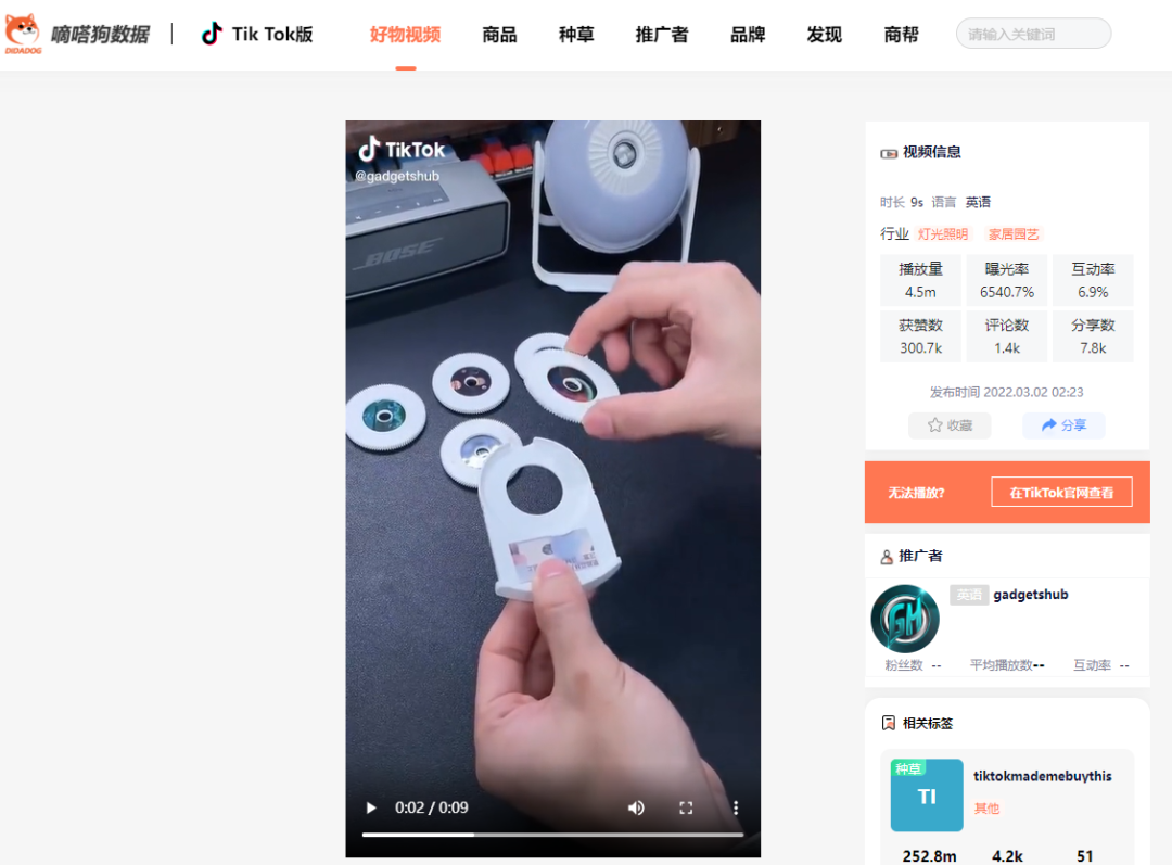 @gadgetshub主要是发布关于灯饰,投影仪相关的视频,目前获得了6万的粉丝,60万的点赞。