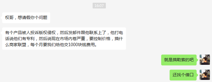 对方声称他们有专利,说现在市场内卷严重,要控制价格,搞什么商家联盟,每个月要求卖家交1000块钱费用。嗯嗯?还说的义正言辞冠冕堂皇?