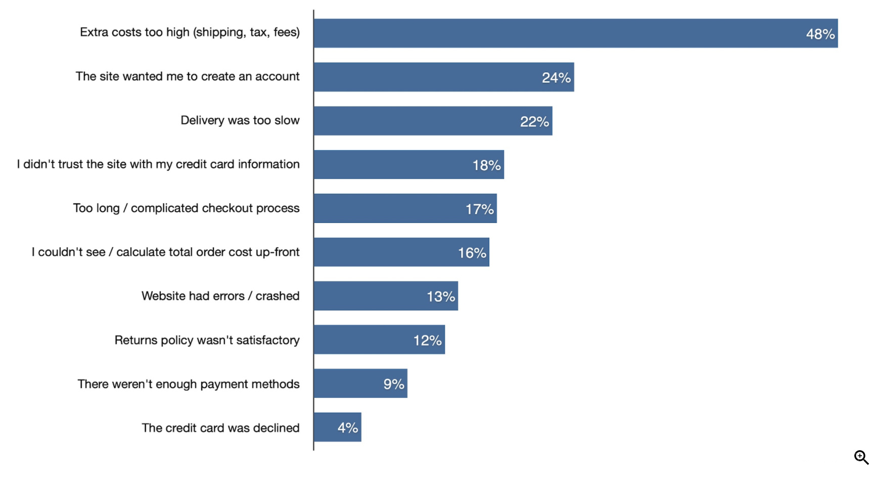 AMZ123获悉,根据Baymard在过去12年研究的全球购物车平均放弃率所计算的40多项研究数据,发现2021年平均购物车放弃率为69.57%。这意味着每10位买家中就有7个买家放弃购买。在比如17%的美国在线购物者在2022Q1季度中放弃了订单,仅仅是因为"结账过程太长/太复杂"。其他放弃购物车的主要原因还包括: