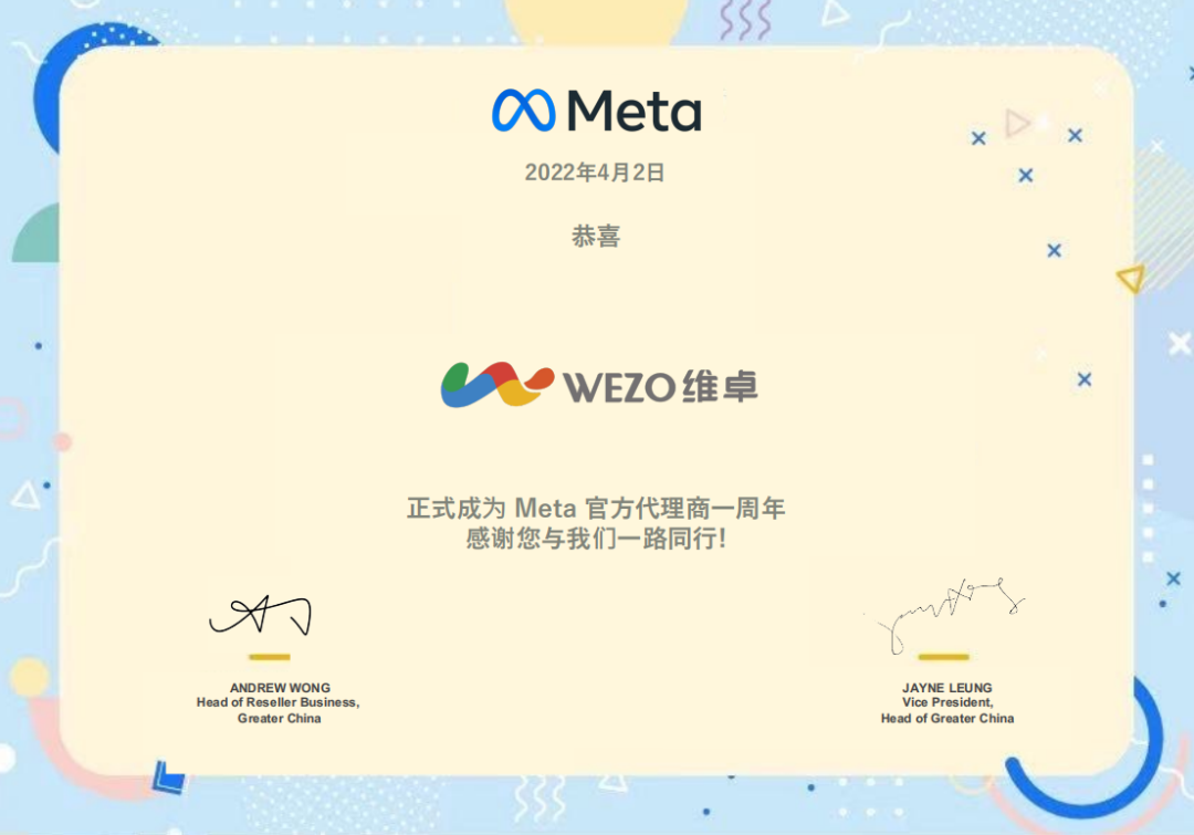 维卓(WEZO)成立于2014年,是一家致力于为中国企业提供海外营销服务的数字营销公司。在2019年、2020年先后荣登"Meta中国区优质合作伙伴"后,于2021年经Meta考察认可,获得Meta中国区官方授权代理资质。
