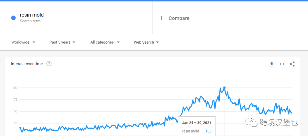 大家有玩过这个东西吗?这种叫树脂模具(resin mold),顾客买了这个产品之后把树脂倒进模具里面然后等待模具成形,就可以得到一个全新树脂产品。之所以会关注到这个品类是因为我设置"评分数低+最近半年上架"的搜索条件之后,软件出现了这个结果。这个品类之前在2021年一月搜索指数去到巅峰,随后逐渐下降,但是仔细在商品结果里面看了之后,让通过软件在选品的我,也找到一个值得学习的店铺,Let's resin。