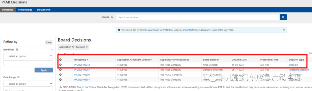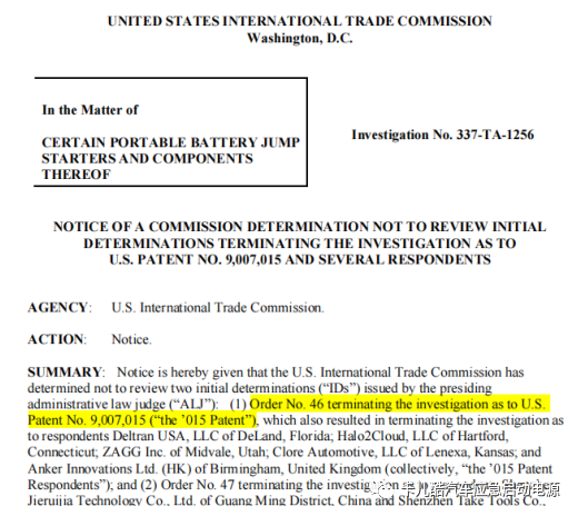 据悉,在该337调查发起之前,华思旭已经于2020年5月在美国专利局法庭PTAB发起了针对NOCO公司015专利无效(IPR)程序,并于在2021年11月成功地获得PTAB认定015专利的22条权利要求无效的裁决,因此逼迫NOCO公司撤回了在337案件中的015专利。