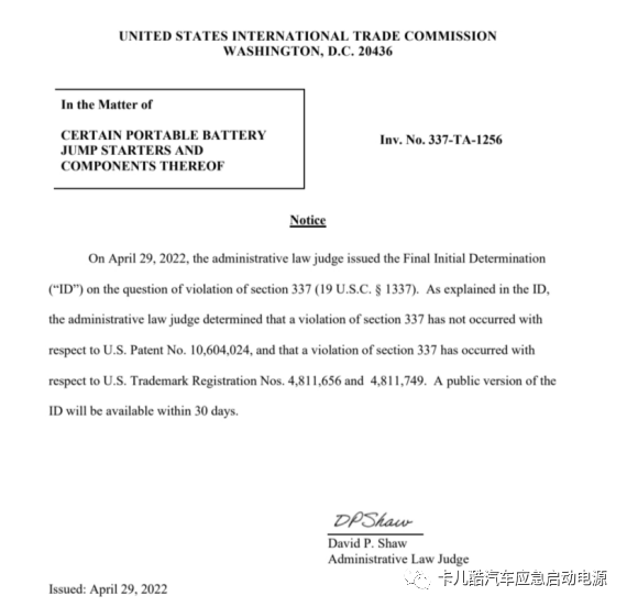 随着ITC庭审汽车应急启动电源企业的"337调查"案,华思旭团队准备了众多的证据,专家报告和充实的其它材料,经过激烈的庭上抗辩,ITC法官于美国纽约当地时间2022年4月29日作出了初裁判决 (Initial Determination),宣判华思旭在美的若干汽车应急启动电源产品没有侵犯NOCO公司024专利。