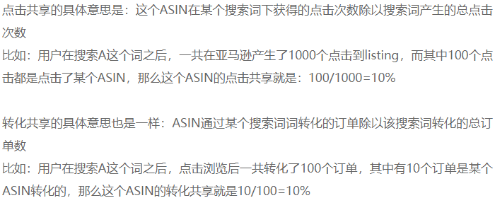 ● 根据点击共享和转化共享,某个词的竞争情况:比如:某个关键词下,前三个ASIN的转化共享之和加起来是80%,那么剩下的所有ASIN就只能分到该词转化订单量的20%,其实也意味着这个词的垄断程度是比较严重的,广告推广起来会比其他词的难度更大