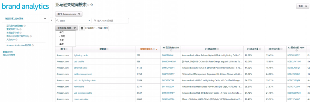 ● 产品开发过程中:在BA功能上搜索待开发产品的关键词,根据搜索排名情况来判断市场的大小产品开发过程中:下载产品关键词的过去12-24个月的搜索排名变化,判断产品的淡旺季情况,跟谷歌趋势同理。如果是已上架产品,则用于备货上做自己的旺季准备