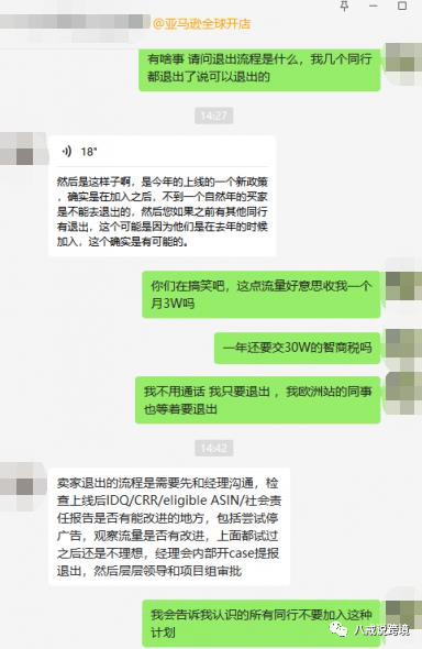 这位卖家贴出了自己和项目经理的聊天记录,用他的话讲:加入(加速器计划)分分钟,退出来要层层审批。对此该项目经理解释道,政策规定加入加速器项目不到一个自然年的卖家是不能退出的。
