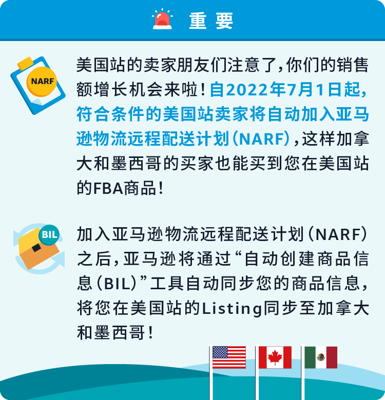 为了帮助卖家朋友们更好地提升销量,并测试加拿大、墨西哥的选品机会,亚马逊推出了亚马逊物流远程配送计划(NARF),助力卖家将存储在亚马逊美国站运营中心(FBA仓库)的商品,销售到亚马逊加拿大和墨西哥两大站点。有了这一物流神器,美国站卖家即可利用一国库存狂揽美加墨三国商机!