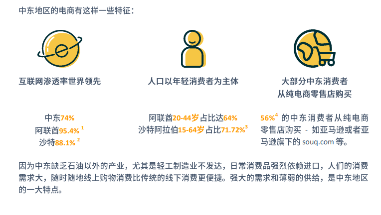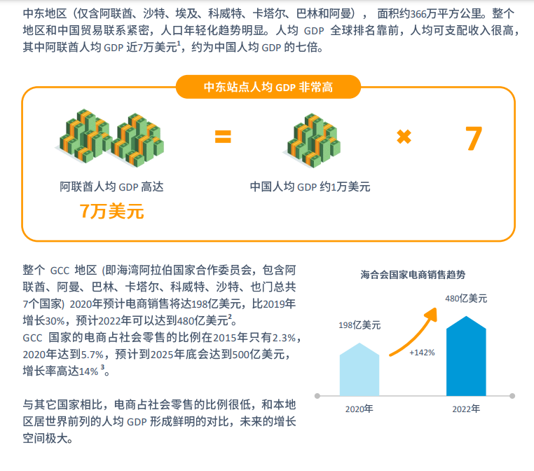 随着大部分基础工作的到位,也就是GCC中东地区处于成为世界上发展最快的电子商务平台的边缘。随着消费者体验意识的增强和支付行业的快速发展,推动了电商商务的快速增长。中东特别是海湾地区收益于高消费潜力,因为它拥有高人均收入。事实上,互联网和社交媒体的渗透率也是世界上最好的,这意味着中东在线业务已经成熟。