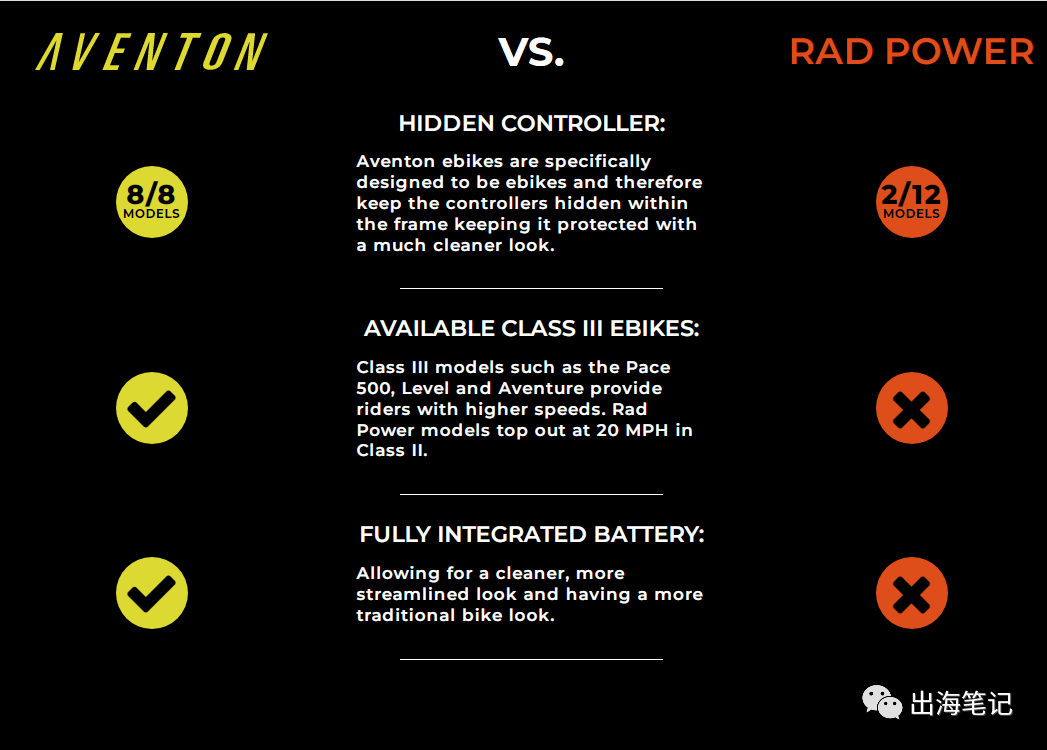 该公司把自己的多个车型与竞品Radpower进行了对比,也在多个方面用数据证明自己的实力还是扛扛的,说句实话,如果我是消费者,看到这种文章,我会直接就冲Aventon了。