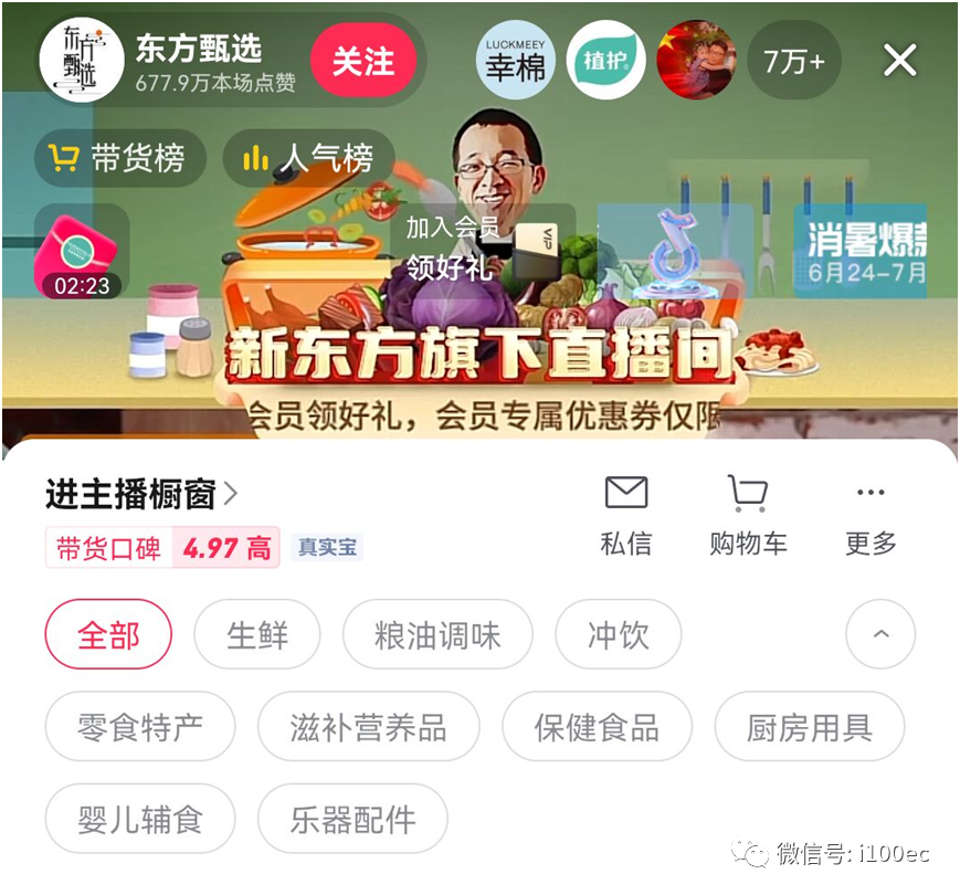 618大促结束后,"东方甄选"依然热度不断,虽说前段时间曝出被投诉的消息,但也很快得到了解决。如今,在"东方甄选"账号的直播间中,商品覆盖面较广,主要以生鲜、零食为主,还有粮油调味、厨房用具等分类。而美妆品类在东方甄选直播间的占比仅5%,开播以来总销售额约1000万,这个数字并不算高。