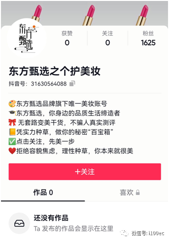 而近日,东方甄选于抖音上线了新账号"东方甄选之个护美妆",并将其作为东方甄选品牌旗下唯一美妆账号。虽然目前还没有发布任何内容,但从账号简介"点击关注,先美一步"可以看出,该账号虽然还未正式开始运营,却已然处于筹备阶段,目前粉丝量为1625。