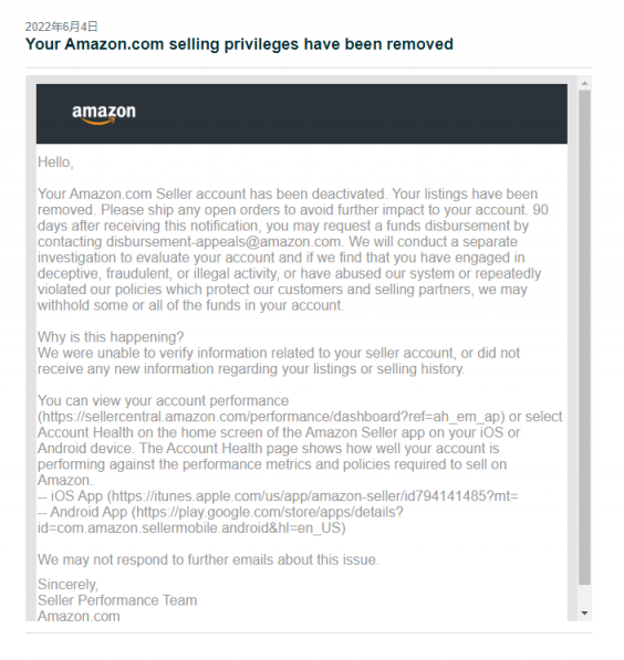 亚马逊在邮件中表示:您的账号现已被停用,所有listing都将被移除。之所以出现这种情况主要系我们无法验证与您的卖家账号相关的信息,或没有收到listing及销售历史的任何信息。