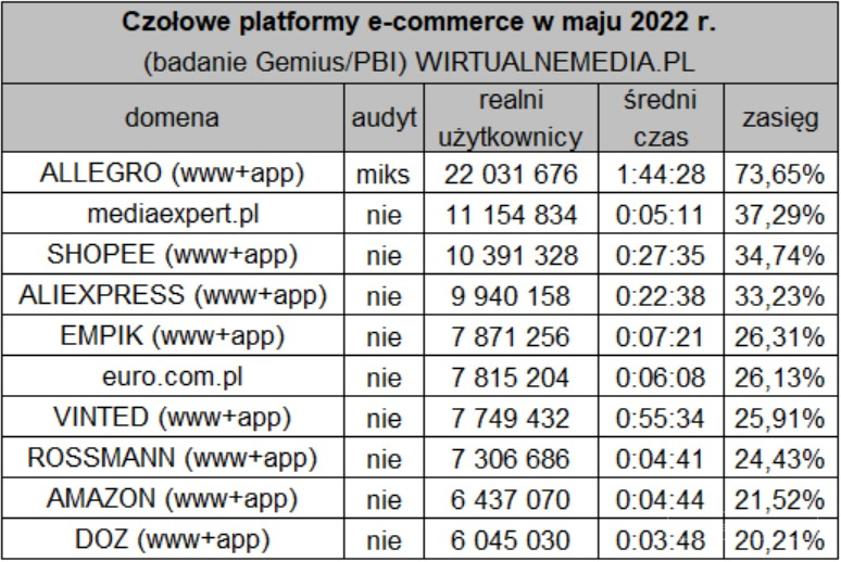DNY123获悉,Mediapanel 发布波兰电商网站5月访问量和访问时长数据。根据数据显示,Allegro 5月访问量达2203万,占波兰互联网人数的73.65%。平均每位用户在Allegro上花费1小时44分28秒。
