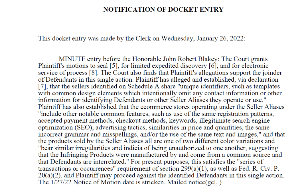 原告还证明,以卖家别名经营的网络商店"包括其他显著的共同特征,例如使用相同的注册模式、公认的付款方式、结账方式、关键字、非法搜索引擎优化(SEO)、广告策略、价格和数量的相似性、相同的错误语法和拼写错误,和/或使用相同的文本和图像",并且卖方销售的产品别名都是一个两种不同的颜色变化和"具有类似的违规行为和相互未经授权的迹象,表明侵权产品由共同来源制造并来自共同来源,并且被告相互关联。"就目前而言,这符合第299(a)(1)节的"一系列交易或事件"要求,以及《联邦共和国公民权利公约》。P20(a)(2),原告可在本次诉讼中对已确定的被告提起诉讼。根据《美国法典》第28卷第1391节和第1400节的规定,本法院的审判地点是适当的,本法院可以对被告适当行使个人管辖权,因为每个被告都直接针对美国消费者的商业活动,包括伊利诺伊州和本司法区,至少通过以卖方别名运营的完全互动的电商,各个被告在伊利诺伊州(包括本司法区)实施侵权行为,从事州际贸易,并在伊利诺伊州(包括本司法区)错误地造成了原告实质性伤害。