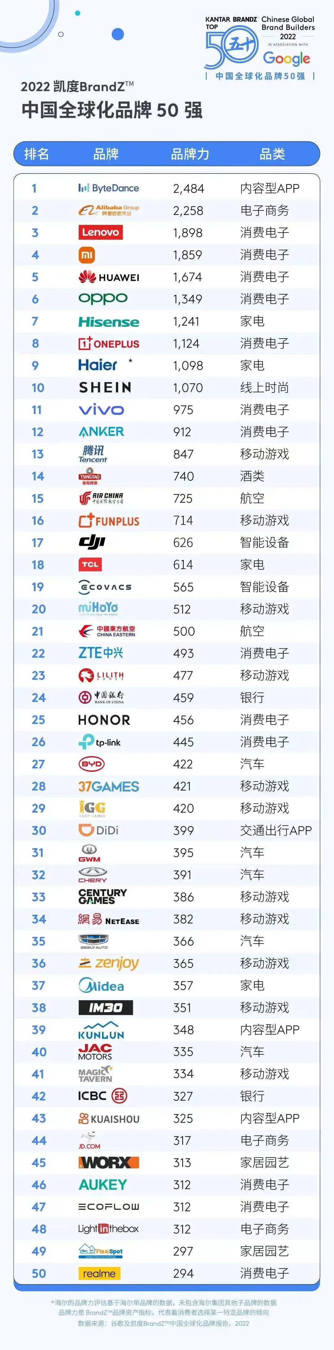 AMZ123获悉,日前,全球知名品牌排行榜凯度BrandZ 在在谷歌年度盛会Think with Google 2022上发布了第六年的《BrandZ 中国全球化品牌》研究报告,揭晓今年全球化品牌50强及成长明星榜单。