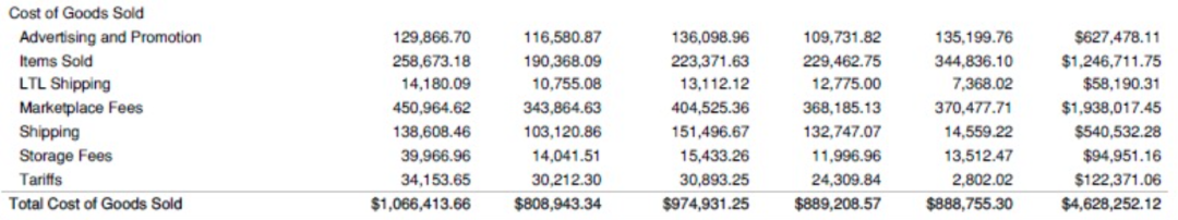 在公司的主要成本构成中,美国卖家的报表列出了以下项目,包括广告促销、产品成本、运输、三方平台费用、物流、仓储、关税等项目,其中,支出最大的费用是三方平台费用,达到194万美金,已经占到总收入的40%,如果加上广告促销费用的63万美金,相当于平台的佣金、广告及各项扣点已经消耗了收入的53%。