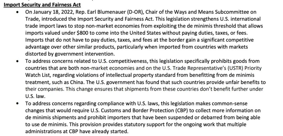 根据该法案,美国将阻止"非市场经济地位地区/国家"获取税务"最低门槛",从而避免"不正当"竞争。其中的"最低门槛",指的是《贸易便利化和贸易执法法》规定的,美国个人进口商品总额度不超过800美元,可以享受免除税收的政策。
