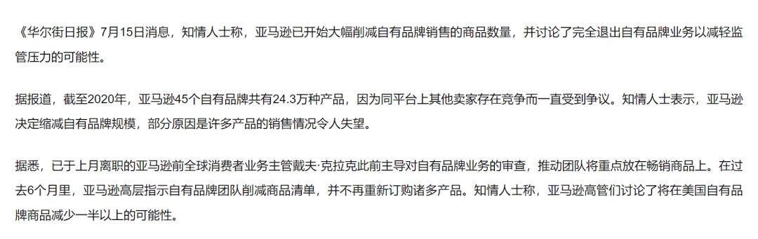 对此,亚马逊方面日前在一份声明中回应称" 我们从未认真考虑过关闭我们的自有品牌业务,我们将继续在这一领域进行投资,就像我们的许多零售竞争对手几十年来一直在做的,我们如今也在继续做 "。