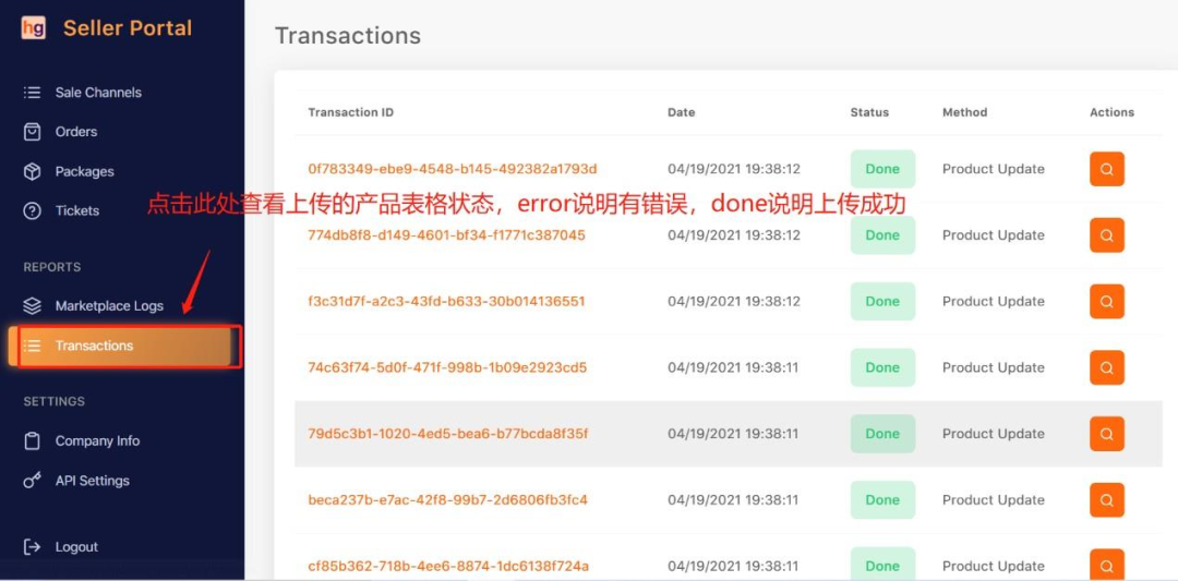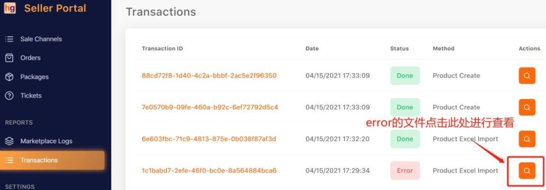 5.若文件上传失败,则点击【Transactions】栏下的小放大镜图标(如下图)来查看错误具体的原因和位置;修改完成后再次上传,直到最终显示【Done】时,产品成功上传。