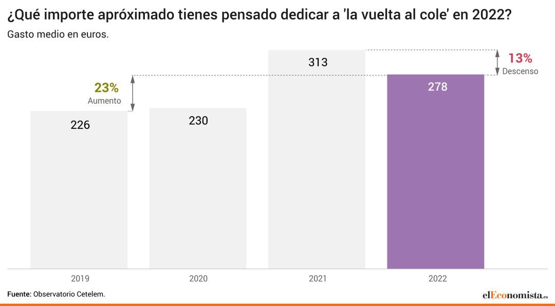 个人金融研究机构 El Observatorio Cetelem 最近公布的一组调查数据显示,西班牙人今年"返校"预期平均支出为278欧元,同比去年313欧元下降了11%。