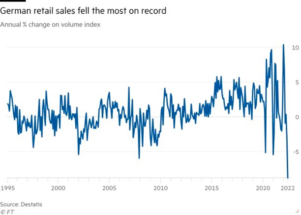 德国国家统计局周一公布的数据显示,6月份零售额与去年同期相比实际下降了8.8%。这是近30年来最大的年度降幅,因为消费价格上涨导致消费者控制支出。
