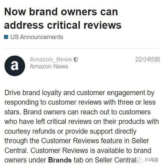 其一,亚马逊美国站和欧洲站发布公告,称将为品牌卖家推出三星及三星以下差评处理功能。据介绍,品牌卖家可以通过退款界面与差评顾客联系,也可以使用卖家中心的顾客反馈功能直接向顾客提供帮助。目前,只有第一账户持有人能够使用该功能,二级账户持有人要使用该功能则需要获得第一账户持有人的授权。亚马逊期望,品牌卖家可以通过该功能增强品牌忠诚度和客户参与度。