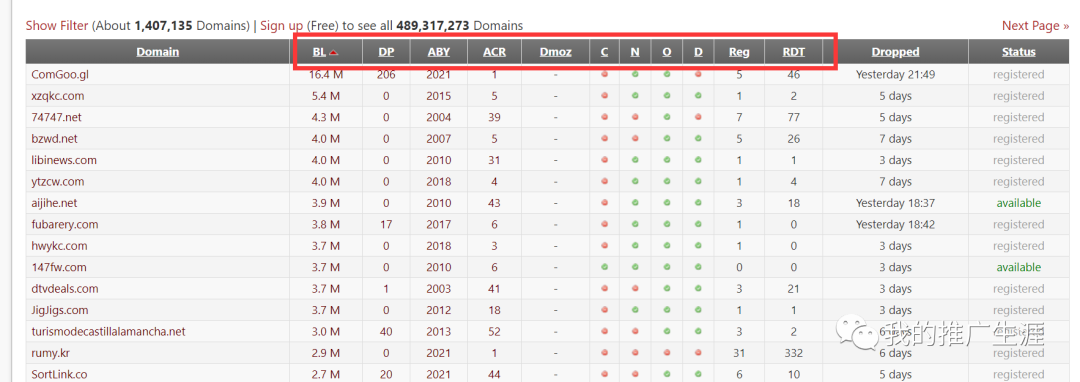 这是一个免费的工具,如上图我们可以直接在搜索框输入关键词,然后会出来很多含有关键词的过期域名。