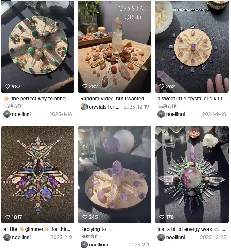 TikTok上带有"#crystalgrid"(水晶阵)话题的作品超2.02万条,"#manifest"(显现)作品有440万条,人们分享疗愈或显化的水晶摆放方式,还有用户讲述亲身经历,作为对星术、塔罗牌等爱好者,水晶相关的网格摆放视频播放量都很高,不同摆放网格及水晶阵套装随之热卖。