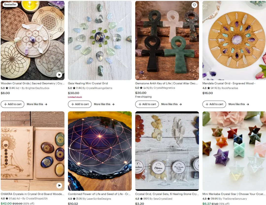 Esty上,水晶网格脉轮画款式多样,尺寸各异,售价在8美元—42美元之间。售价9美元的水晶网格盘,共售出17.9万单,总销售额超161.1万美元(约人民币1122.1万元);售价42美元的水晶阵套装,销量超6.13万单,总销售额超257.46万美元(约人民币1793.28万元)。